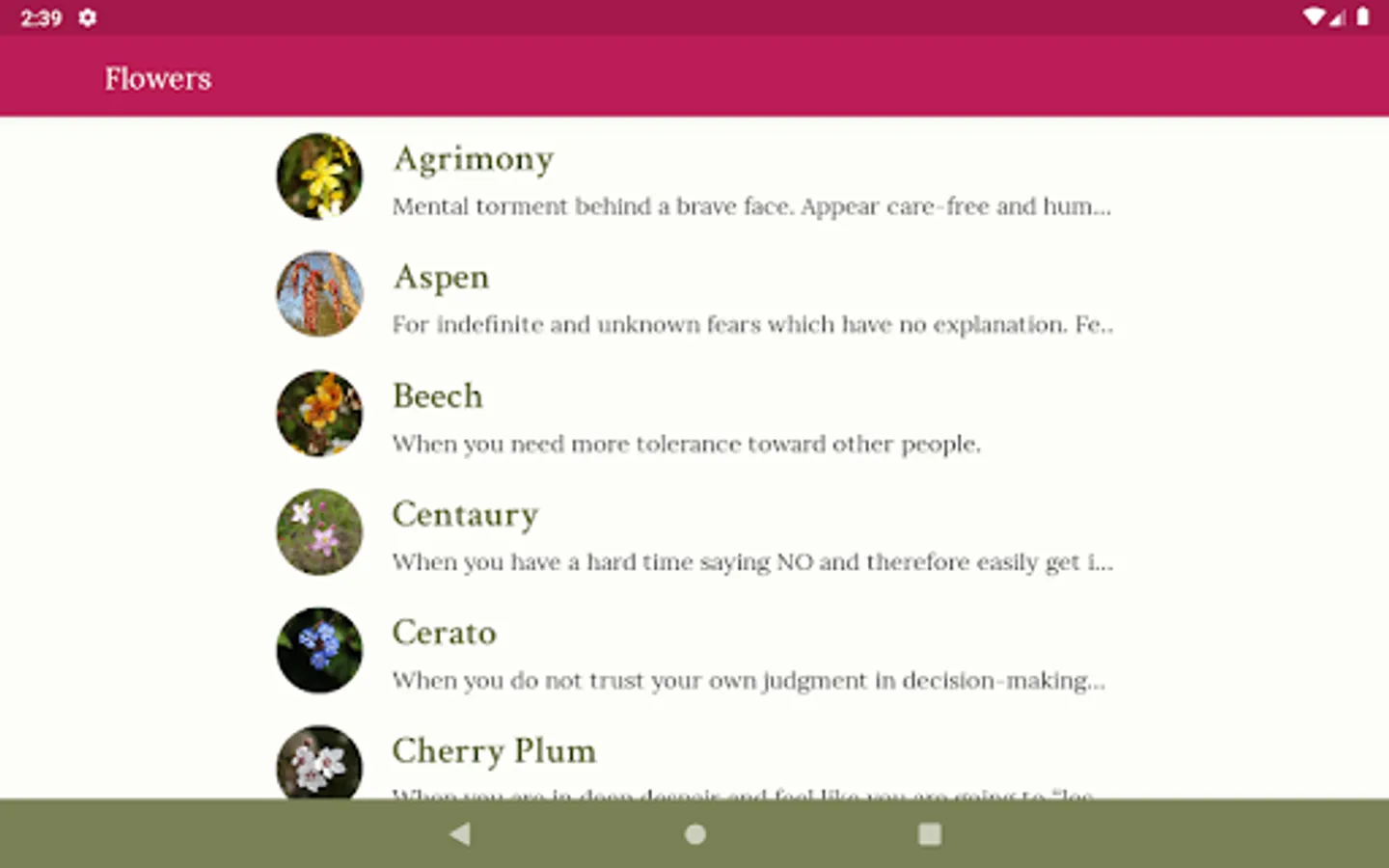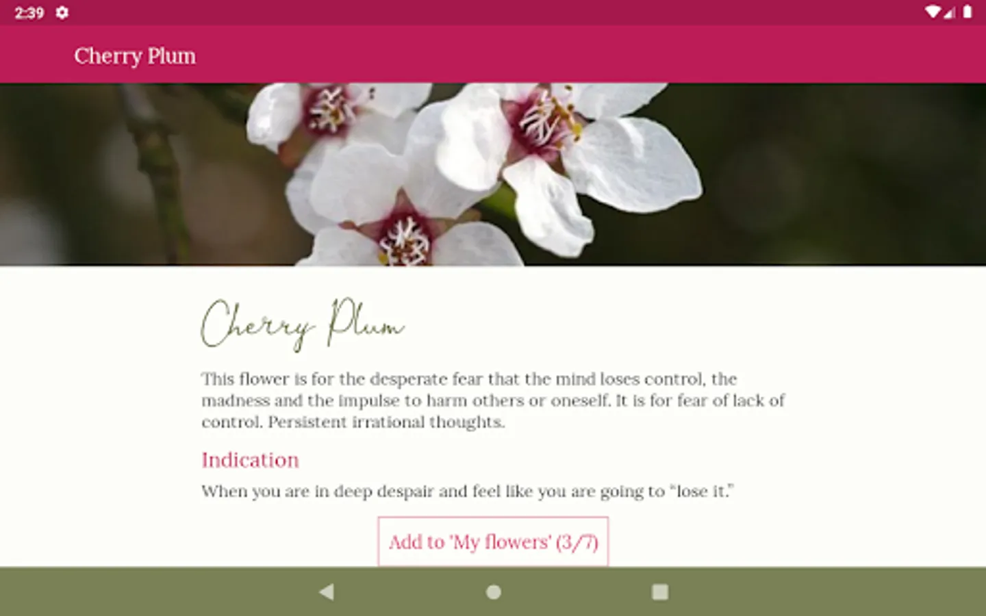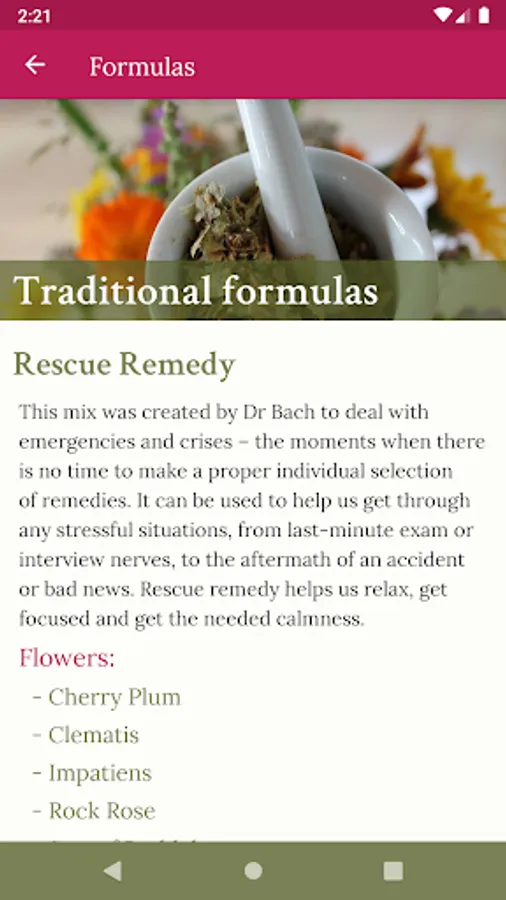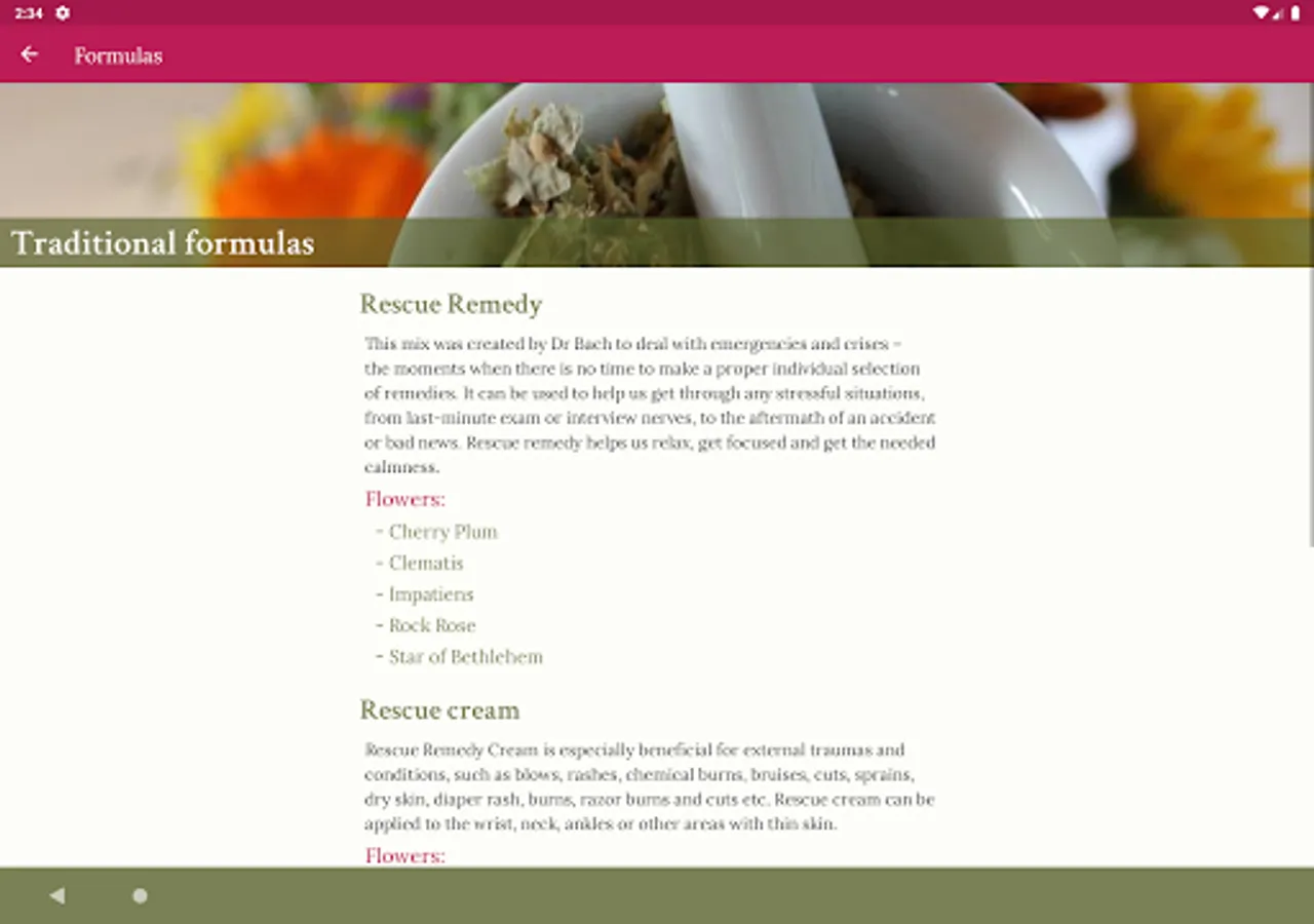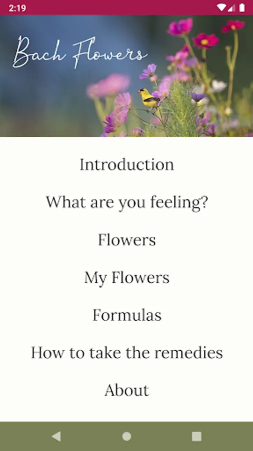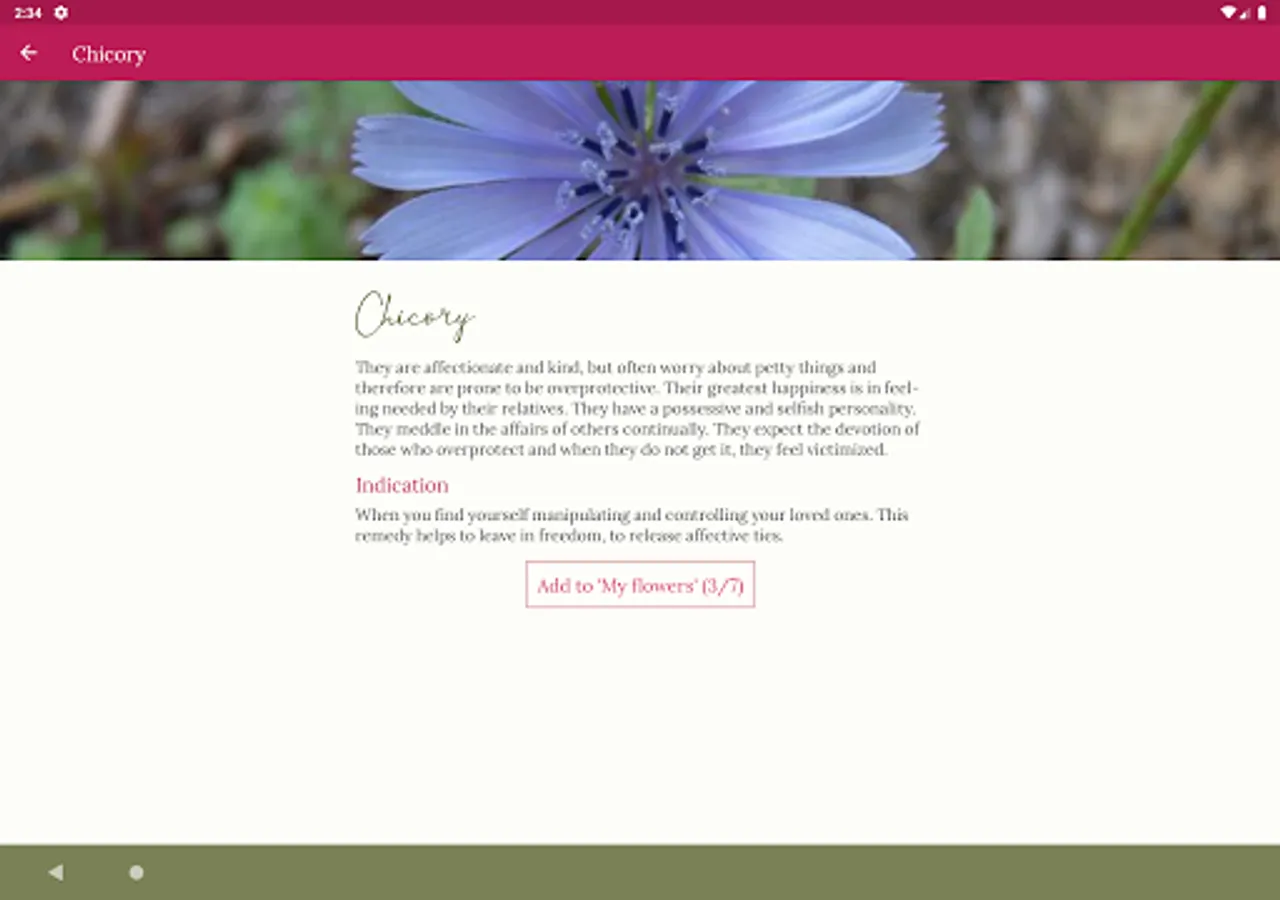 This application seeks to help professionals and the public in general, to find more easily the flowers that best suit their needs, respecting the principle of "simplicity" of Dr. Bach. Whose central message was: "We are all healers." It was the will of Dr. Bach that anyone could prepare their own treatment and that is why he created a simple choice of flowers. Even so, it is always advisable to go to a professional therapist when the problem is chronic.