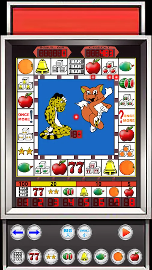 - There are 8 symbols to bet including: Apple, Orange, Cup, Watermelon (fruit) and Bell, 77, Star and BAR.