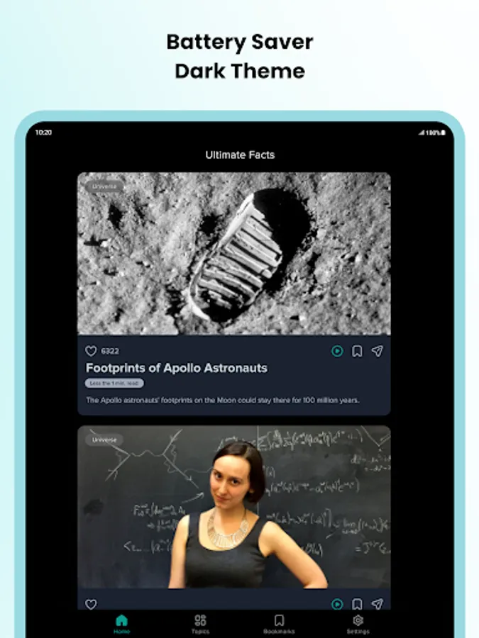 In Ultimate Facts you will find lots of fun facts that are not only interesting but also informative. You can go with a specific topic or let the app present you with random facts. You can bookmark your favorite facts for later viewing and share them with your friends. You can read the detailed article of the truth you want, or even go directly to the source of information.