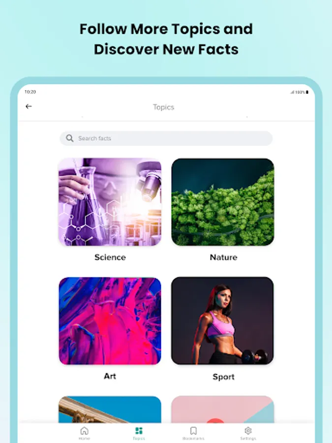 We have brought together the most interesting and informative facts about hundreds of subjects from History to Health, from the Universe to the Brain, and Sports to Animals. When you specify the topics you want to be informed about, you will see the appropriate facts.