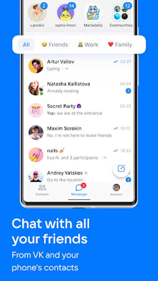VK Messenger is a fast app for chatting. Stay in touch with friends in chats and calls.