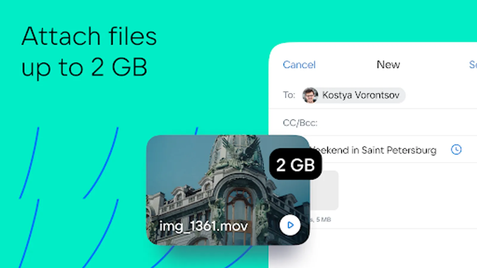 Sending large files. You can attach an entire movie or all photos from your vacation to an email: VK Mail agent can send files up to 2GB without compressing them and turning them into links.
