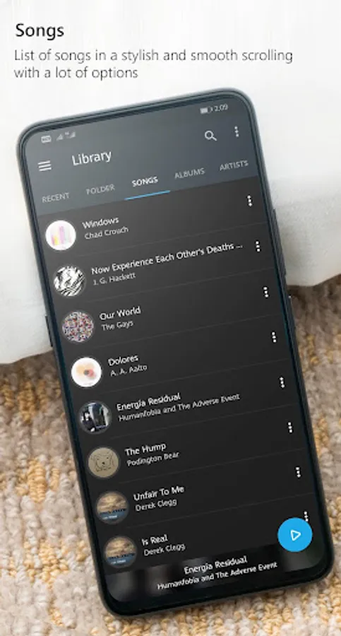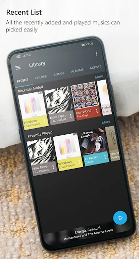 Easily pick the recently added and recently played songs form the home screen. you can clear those data also in the settings.