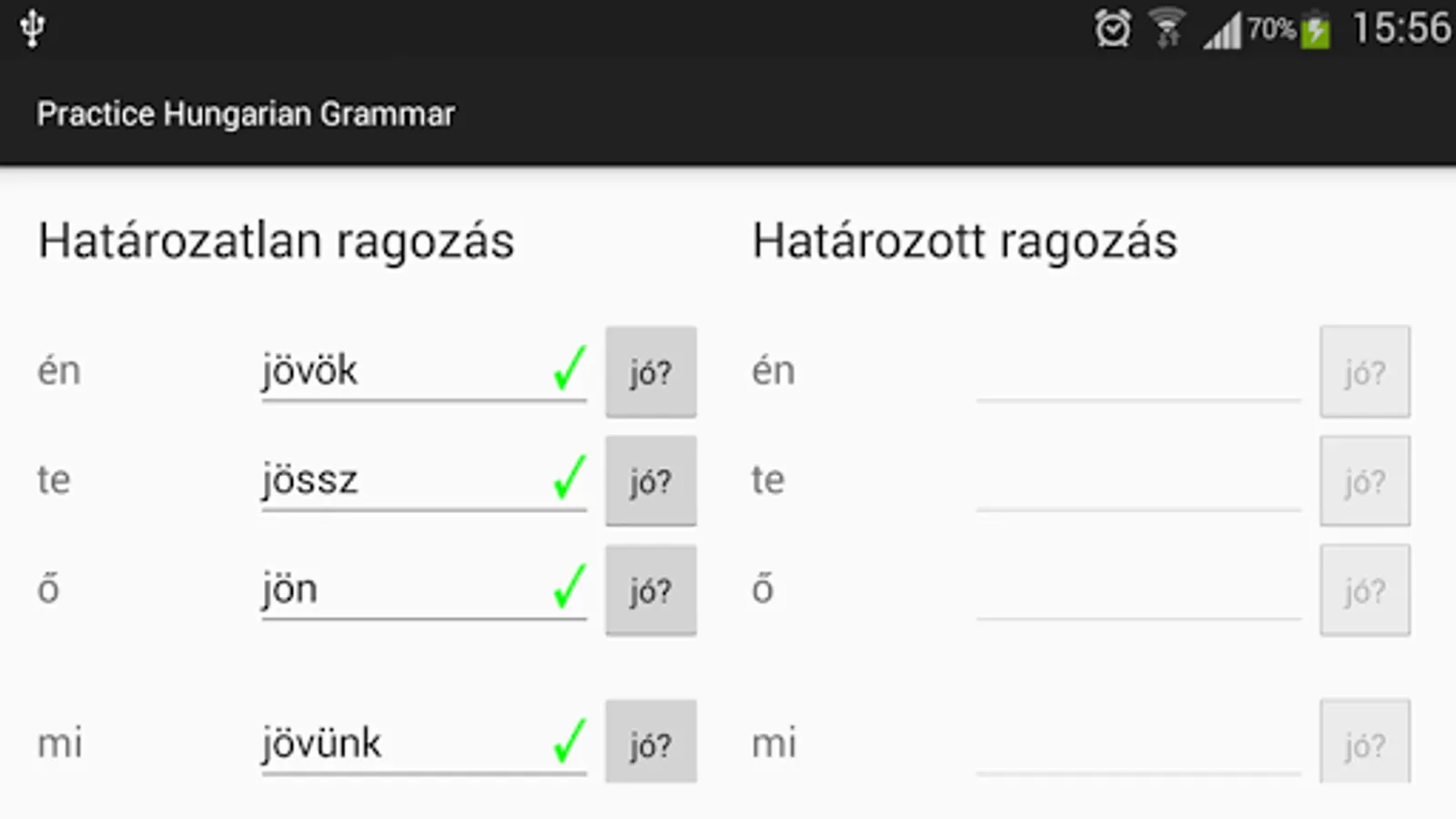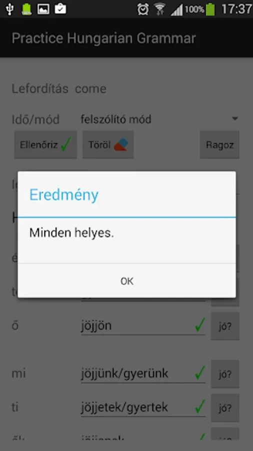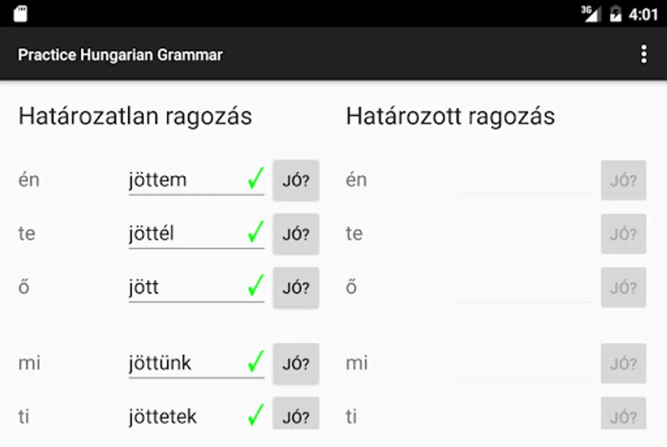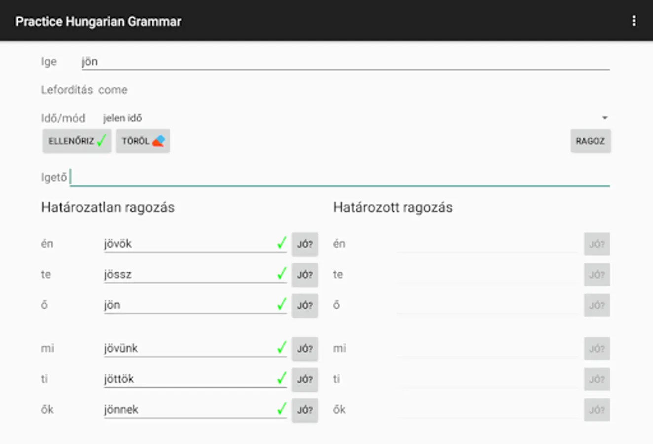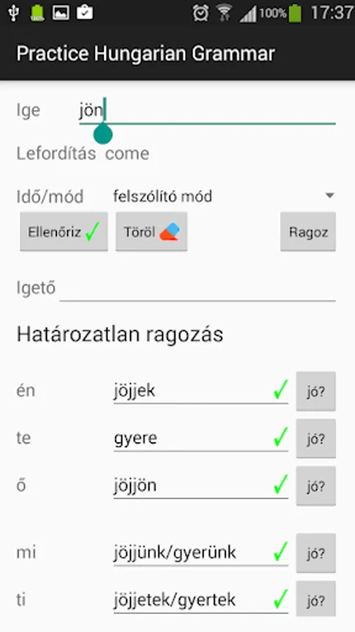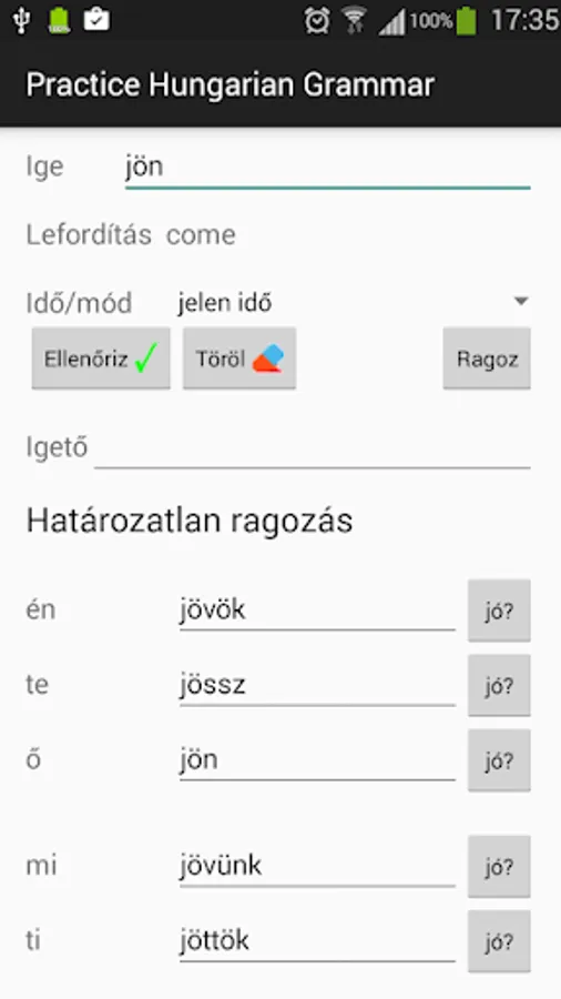 Allows the user to learn and practice Hungarian conjugation. Contains around 900 verb in all tenses and modes. It is also able to conjugate unknown words by applying grammar rules. The user can look up for correct conjugations of verbs as well as test their knowledge.