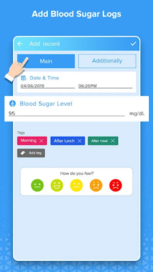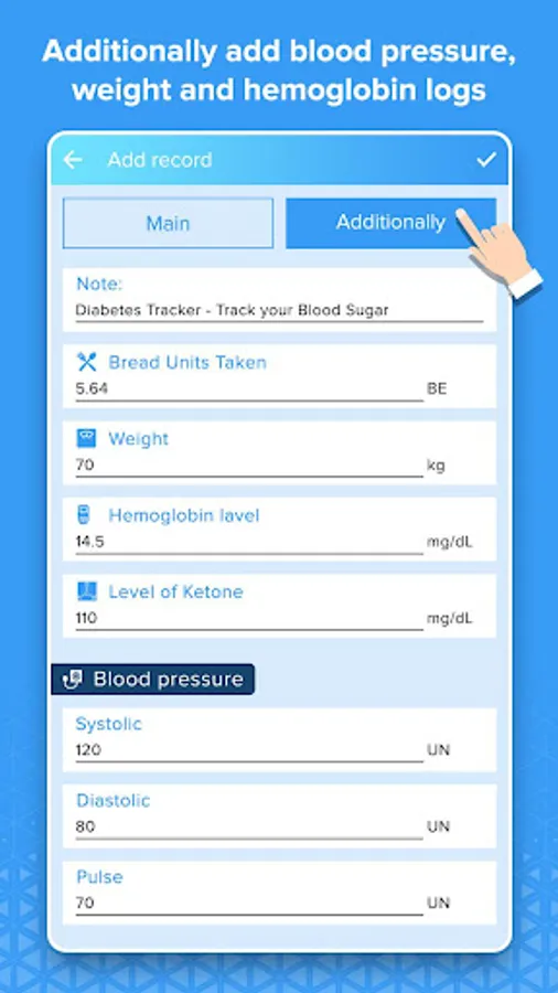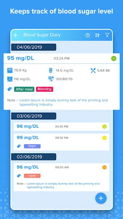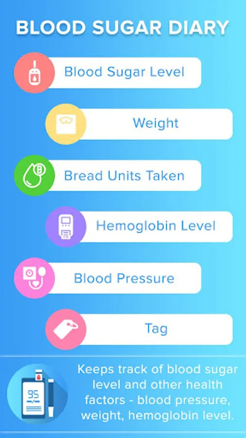 Blood Sugar Diary - Health Tracker keeps track of your health factors like blood sugar / glucose level, blood pressure, weight, hemoglobin level. In addition, you can also add tags, mood and breads units taken.