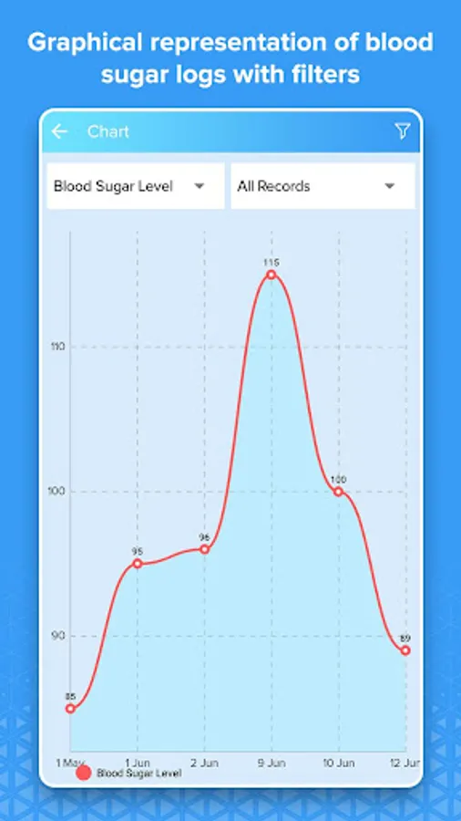 You can view the charts of blood sugar / glucose level, weight, Bread unit taken, blood pressure, mood condition, hemoglobin level. You can view filtered chart data by tags and time.