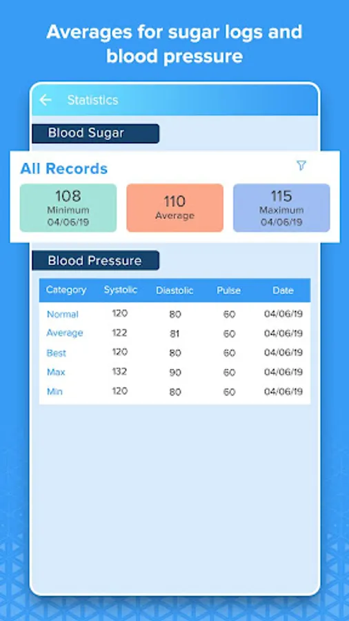 You can view statistics of Blood sugar / glucose level (minimum, average, and maximum), Blood pressure (minimum, average, and maximum) and weight.