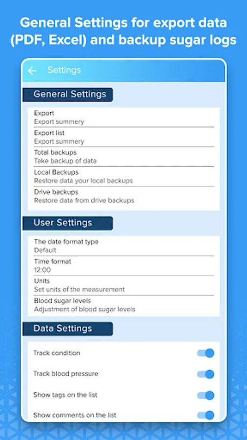 You can export health report in pdf or excel format file. Later you can open, share, and delete these files. You can take backup of your health data on your local device or on google drive. You can restore old health data from backup.