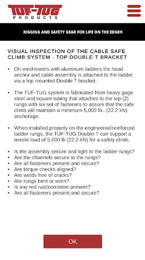 The Tuf-Tug Inspection App lets you complete an inspection of a Cable Safe Climb System installation.