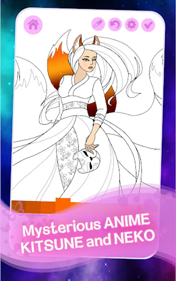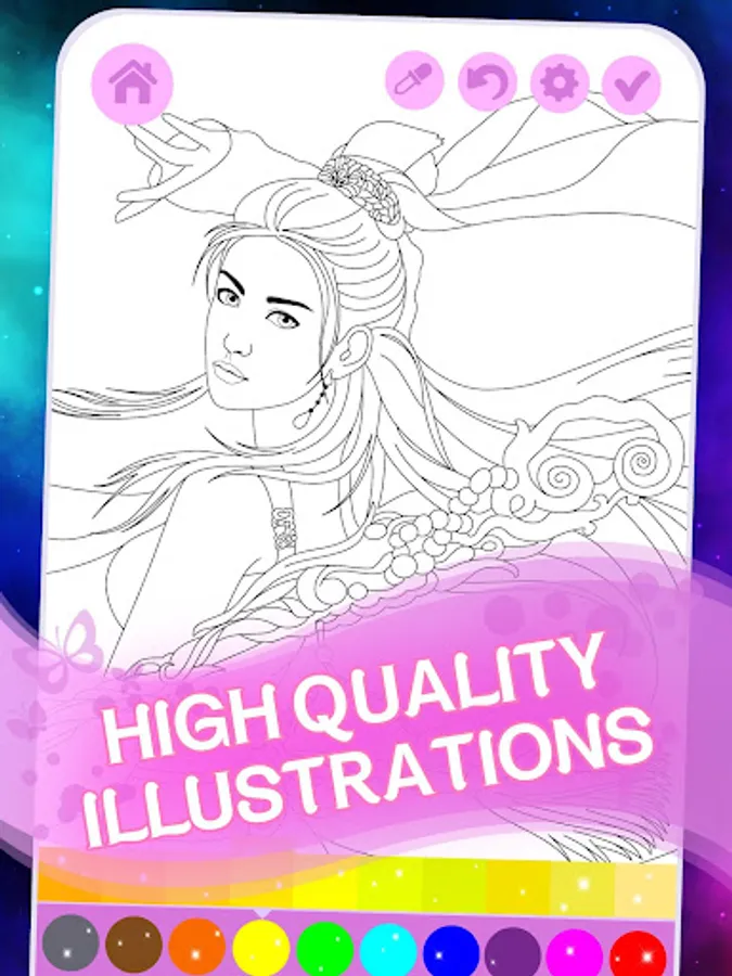 Fantasy Love Coloring Book is organized in a simple way, so you could easily select a color from the palette and start drawing:
