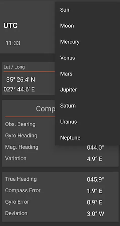 The application calculates the Sun and planets azimuth based on observer's location and time of observation.