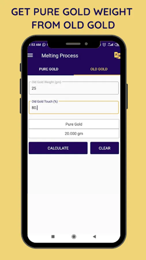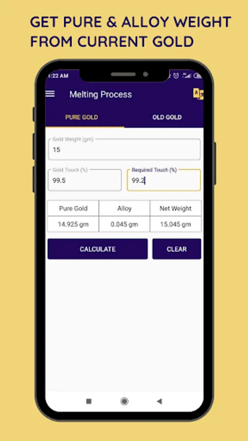 Melting process calculator is useful for goldsmith to calculate the weight of pure gold and alloy needed for the melting of gold to make ornaments.And also calculate the pure gold from the old gold weight and touch.