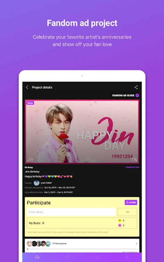 -With Mubeat Fandom Ads, you can celebrate your artist's anniversary with other fans through subway ads, rewarded video fandom ads, and more!
