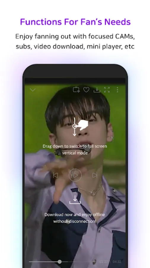 Subtitles, Landscape Mode, Mini Player, Video Download, Full HD Videos, Display Board Notices, Wall, KPOP Quiz, and more.