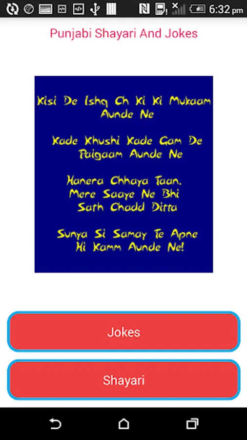 Its an App for Punjabi Language Lovers.You can browse funny punjabi jokes and shayari ,poetry.Send these to your grilfriend loved one and express your sad ,heartly feelings to them.For you sad ,romantic,missing ,love,happiness etc type of shayari are there.