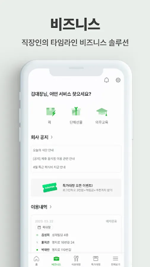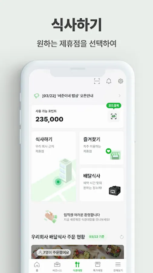 Issuance of meal tickets to employees' smartphones. Menu preview, simple payment available