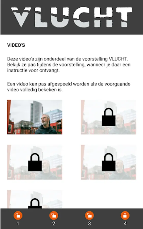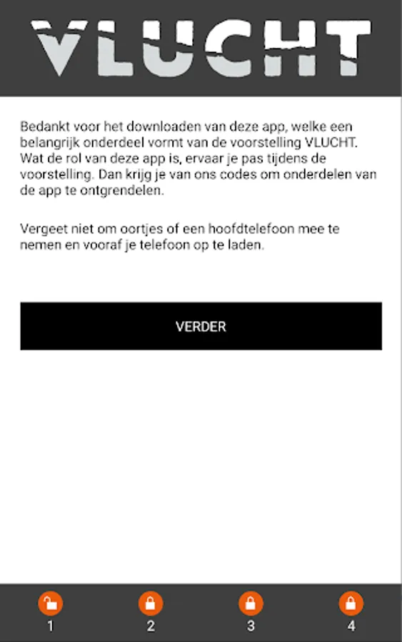 The FLIGHT app is part of the show of the same name, written and performed by Eric Corton and produced by Solo Stories. In the FLIGHT app, you listen to an audio introduction and watch a number of videos during the performance to fully experience the performance. All parts are locked. At the performance you will receive codes to unlock the parts.