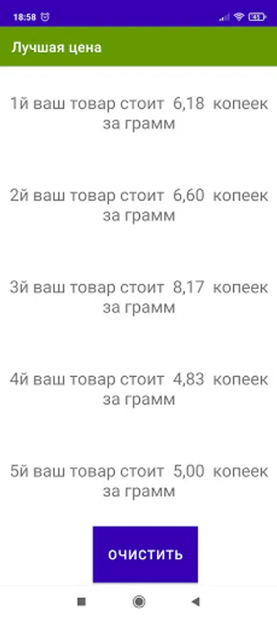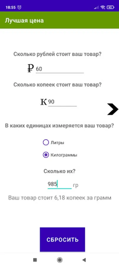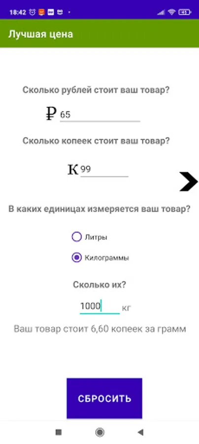 The interface is concise and clear. In the first field, you enter the rubles indicated on the price tag of the product. In the second field - a penny. In the third field, you enter the weight or volume of the item.