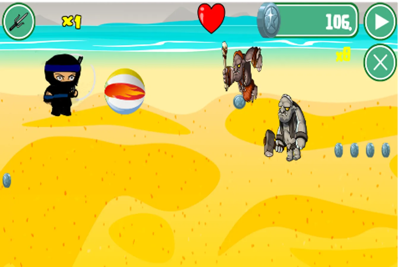 Simply use tap to move the Ninja or throw the weapon at your enemies. Keep in mind that there are many obstacles that you must be avoided. You have to target and kill the enemies to keep yourself from being killed and earning coins. You will certainly love to collect balls along the beach. These sand power balls will upgrade your power and give you extra strength to fight your enemies. Be careful not to fall into the trap designed in Sand Power Balls game, or your adventure ends and you will need to start from the beginning again.