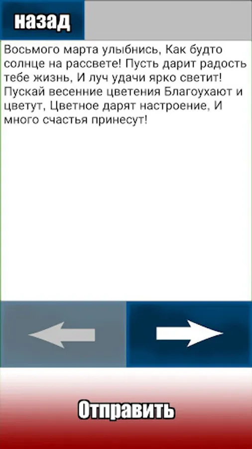 On the 8th of March! Now congratulate loved ones even easier. With this app you can send a text message with a template congratulation. And just before departure you can change the greeting as soon vzbredet mind =).