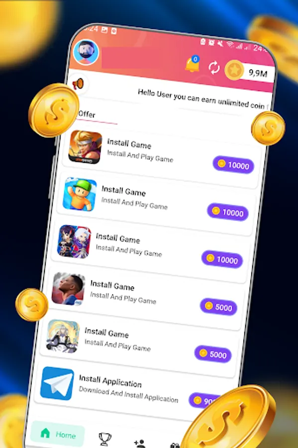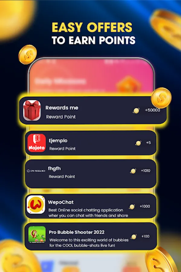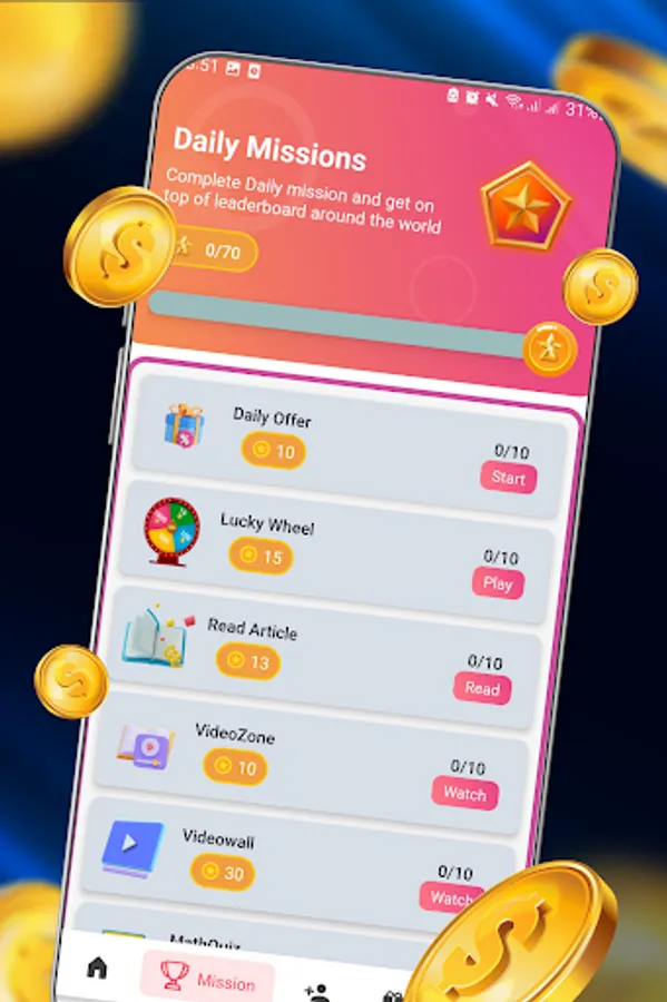 To earn rewards, select a MISSION, install the app, fulfill the requirements and get the reward. In the case of a survey, answer the questions honestly and get rewarded. In the quiz offer, answer the question correctly to get the reward.