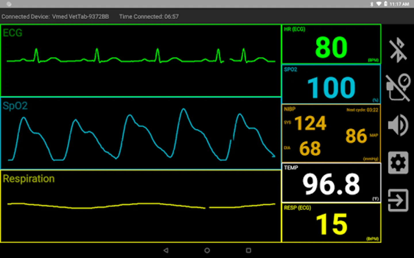 The Vmed Technology VetTab Android app allows you to view the vital signs measurements of your Vmed Technology VetTab veterinary surgical monitor over a Bluetooth connection to the app.