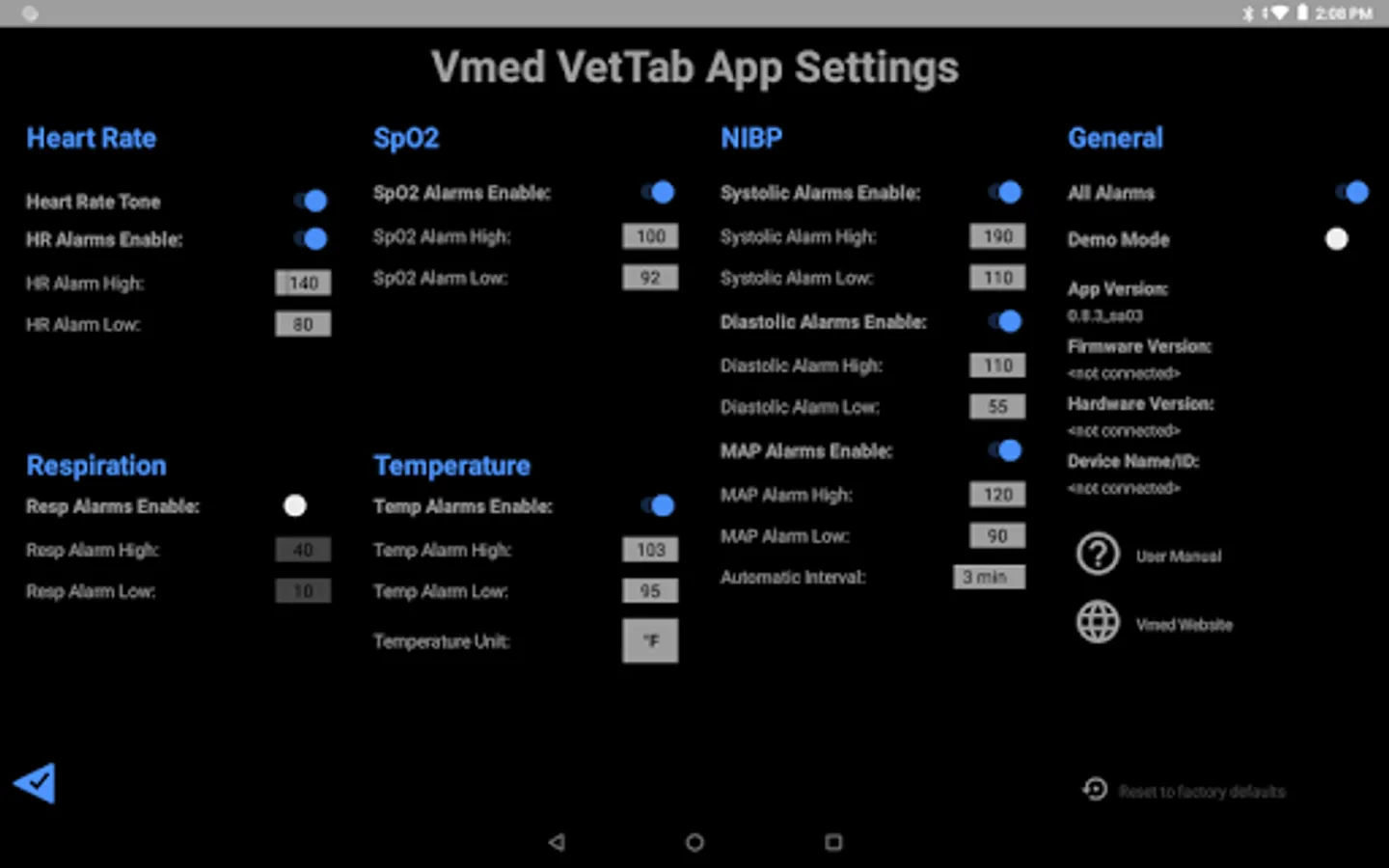 In addition to connecting to a live monitoring session, the Vmed VetTab app also allows a "Demo mode" where preset values are displayed as though the app had a Bluetooth connection to a live VetTab monitor. This is meant for evaluation of the app's display capabilities.