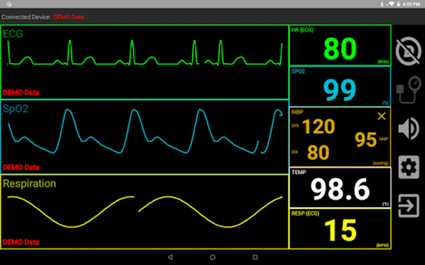 The app's settings allow you to modify alarm limits for each vital sign parameter. Then, if a value extends outside of the set limits an alarm will sound and the value will turn red to notify you. And, if sound is enabled then a heart rate tone will sound if either an ECG or pulse from SpO2 is present.