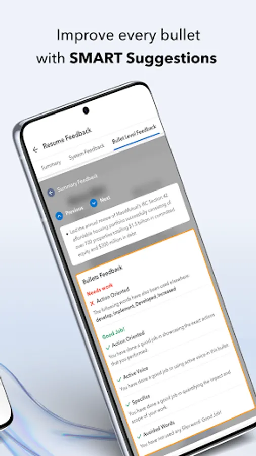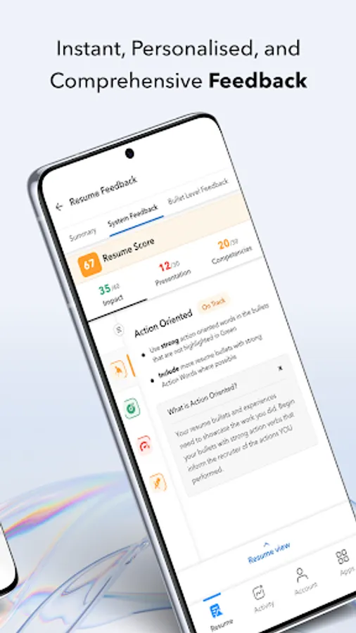 ● Get personalized and actionable guidance as well as targeted bullet level insights to power up your resume – on the go