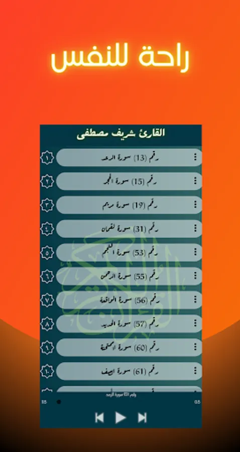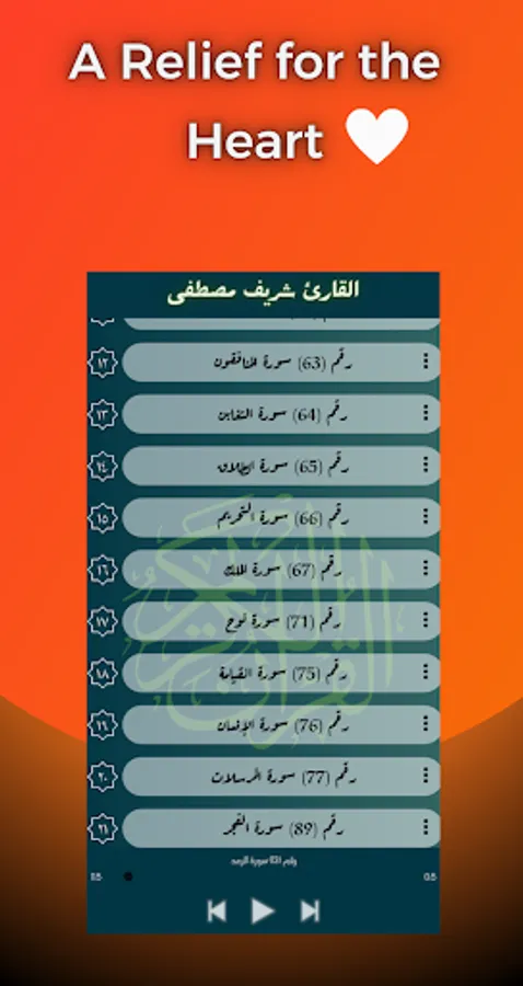 The Sheikh Reciter Sharif Mustafa application without the net contains a recording of surahs from the Holy Qur’an with: