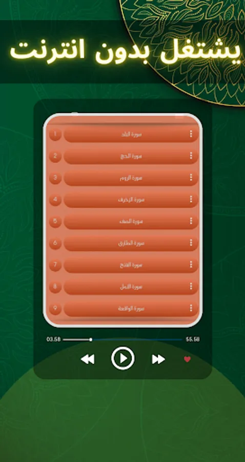 The Sheikh Reciter Ahmed Khadr application contains a recording of surahs from the Holy Qur’an with: