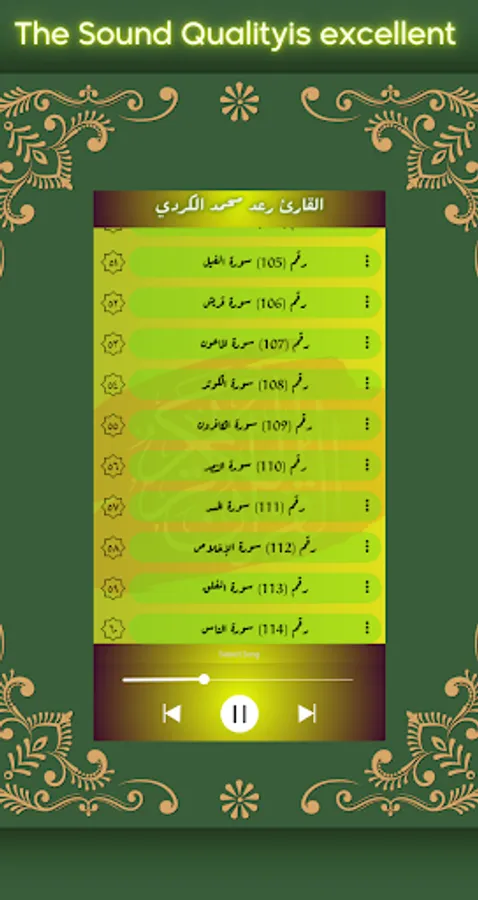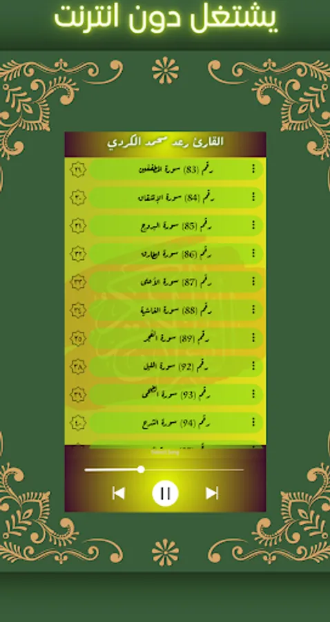 The application of the Noble Qur’an for reciter Raad Muhammad Al-Kurdi contains: