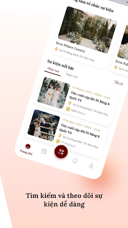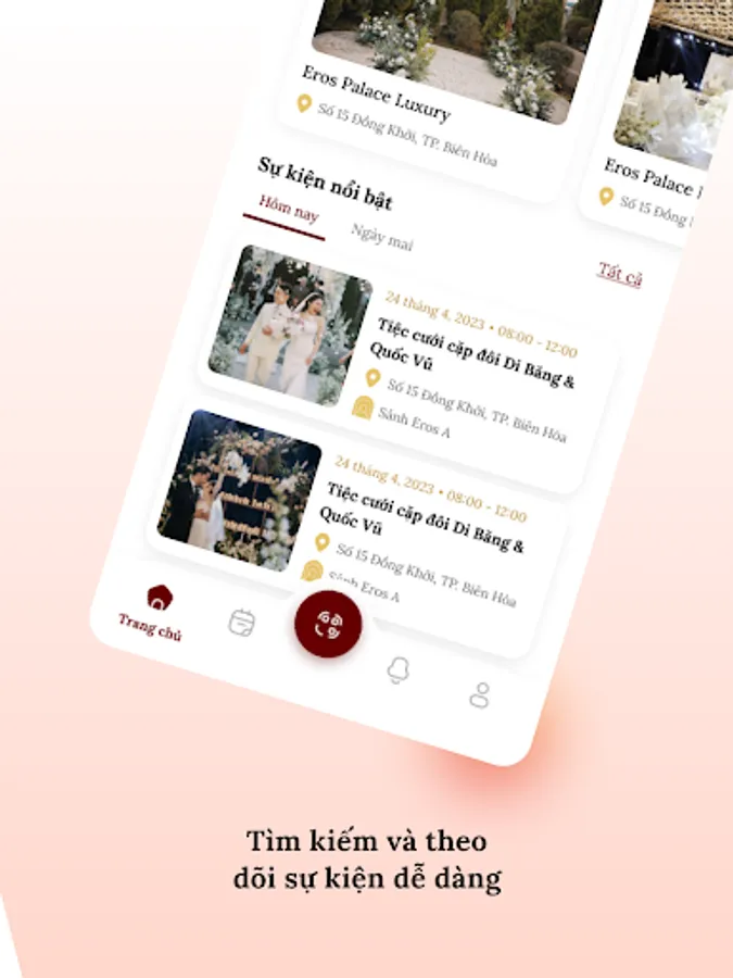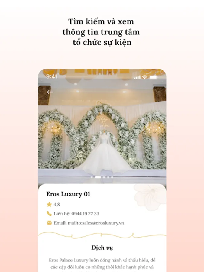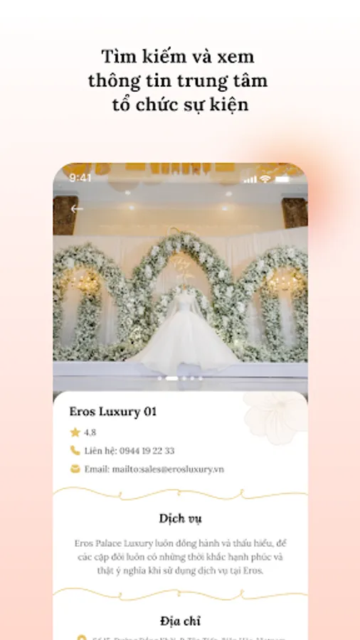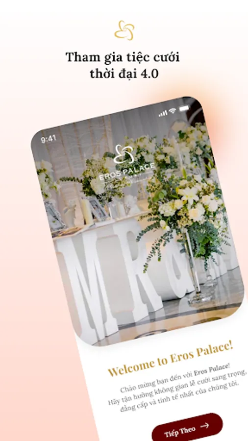 Event 4U - Smart technology application provides useful information about the event center at Eros Palace Luxury including information about the banquet hall, location, convenient services, .... and other details. You do not have to worry when you do not know the location of the party hall or the service here because Event 4U is always with you, always supporting and providing information when you need it.