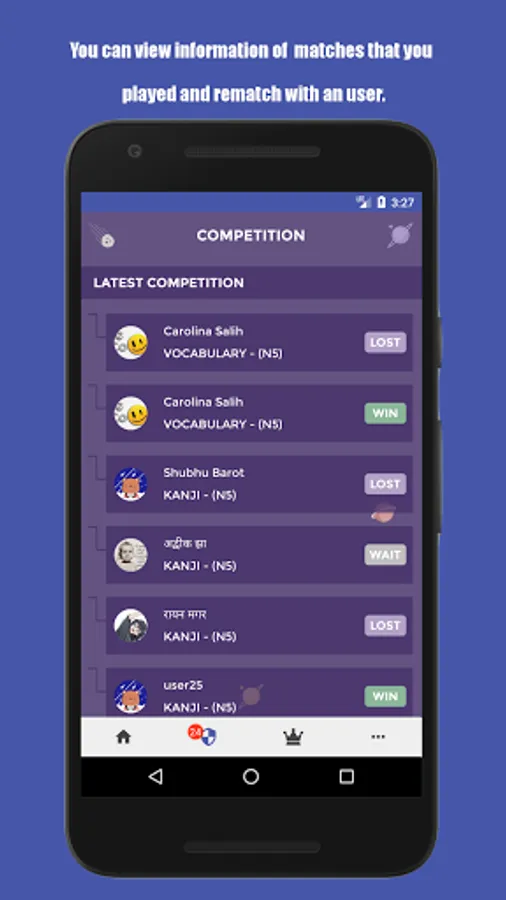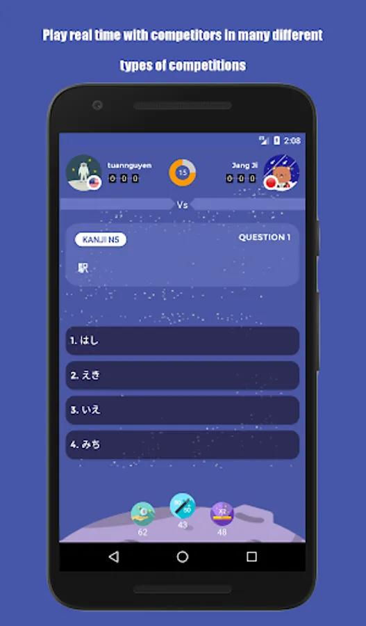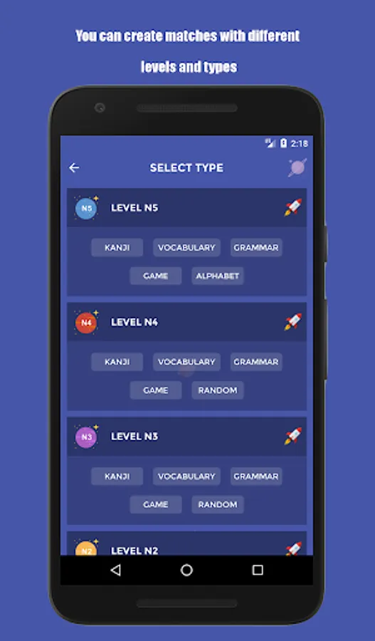 ・Types: kanji, alphabet, vocabulary ,grammar ,game ,random.