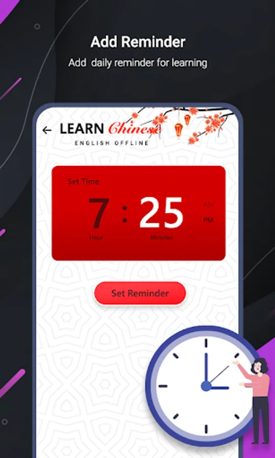 - Set Daily Reminder setting to learn daily new Chinese words with specific time.