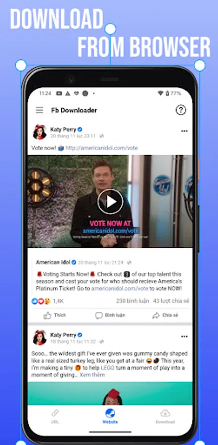 Video downloader helps download videos from Facebook from: News Feed, Watch, Friend Wall, Groups, Pages, friends, etc. Easily download multiple resolutions video from Facebook with our facebook video downloader app.