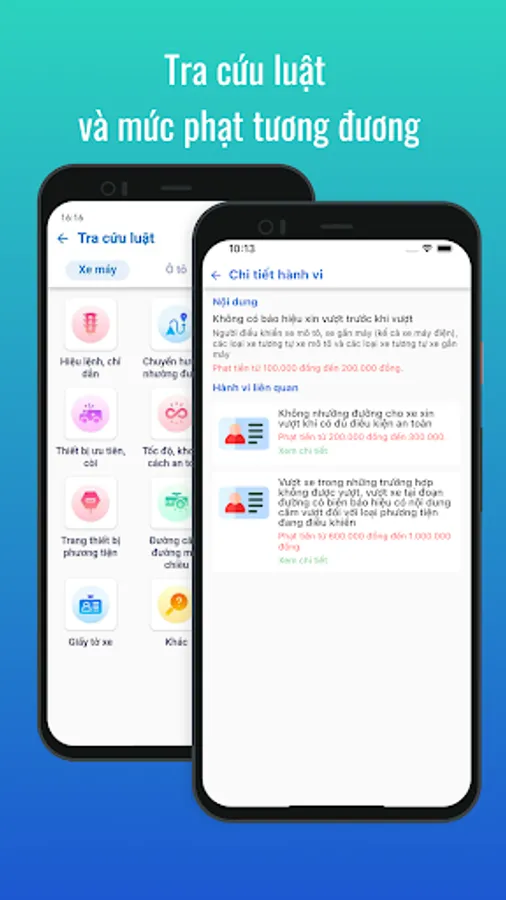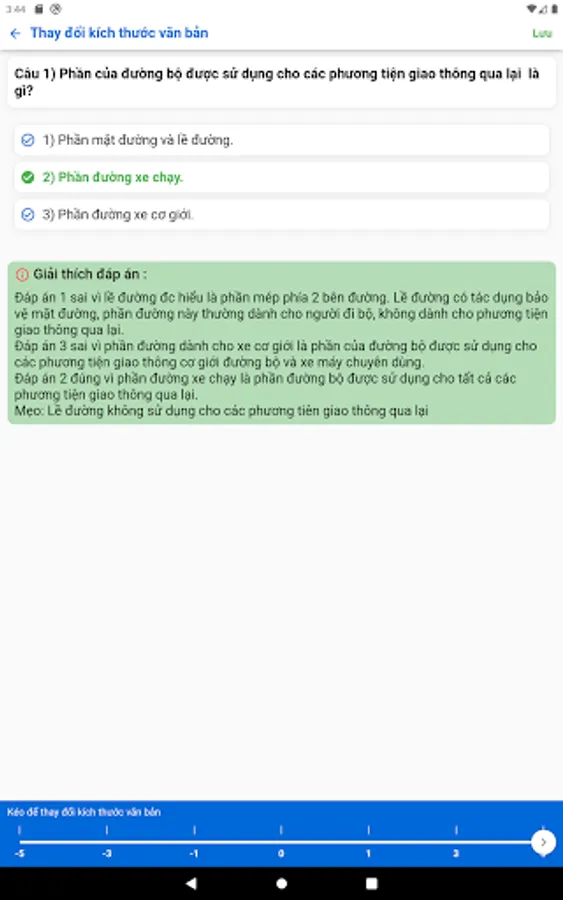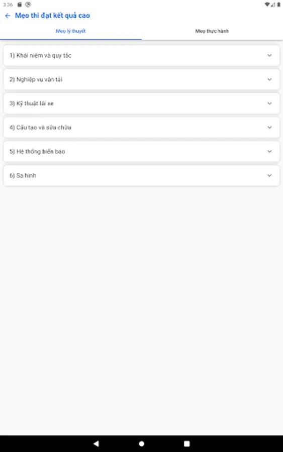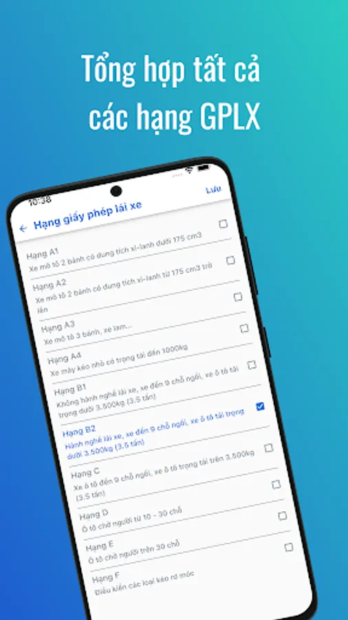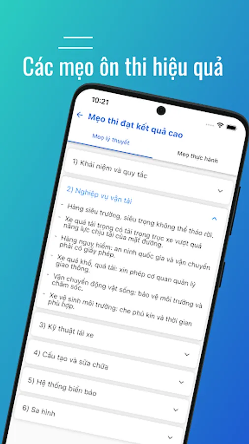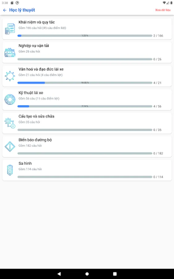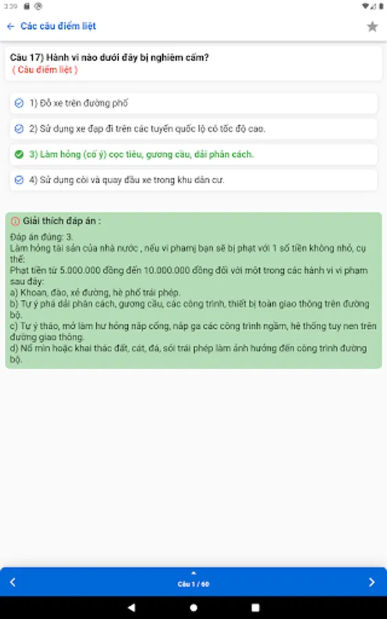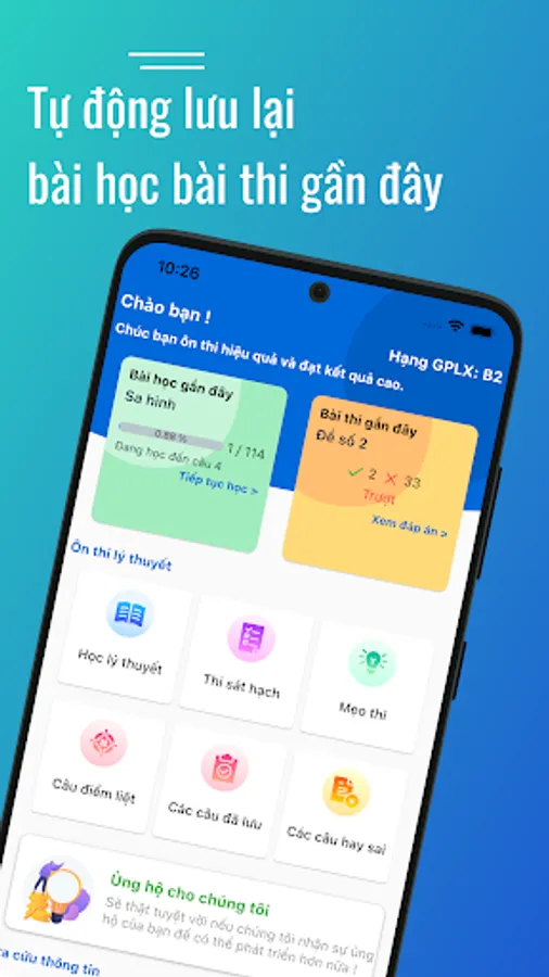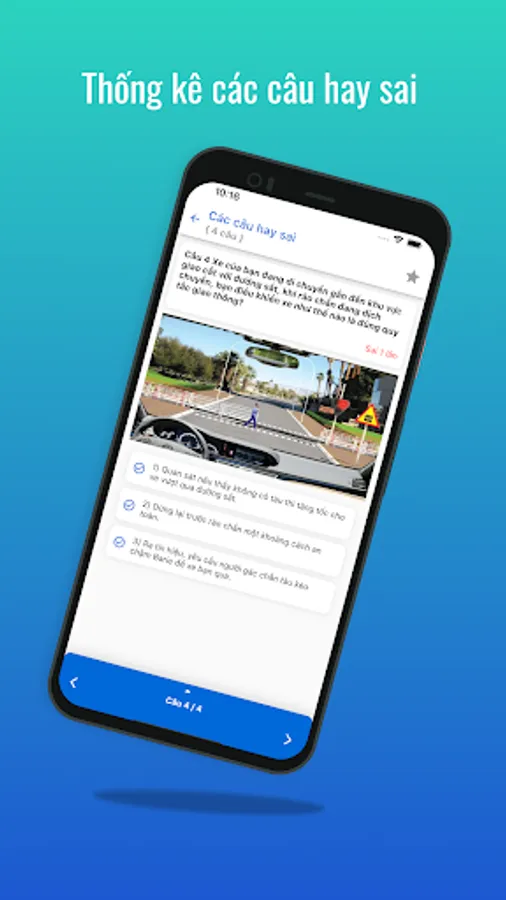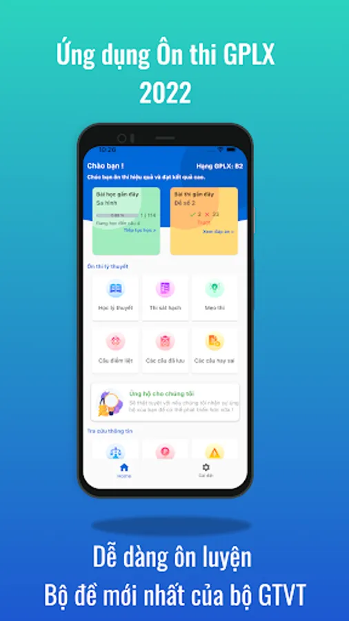 • Random exam with thousands of questions according to the structure of the National Road Administration of Vietnam Ministry of Transport for driving licenses B1, license B2, license C, license D, license E and license F.