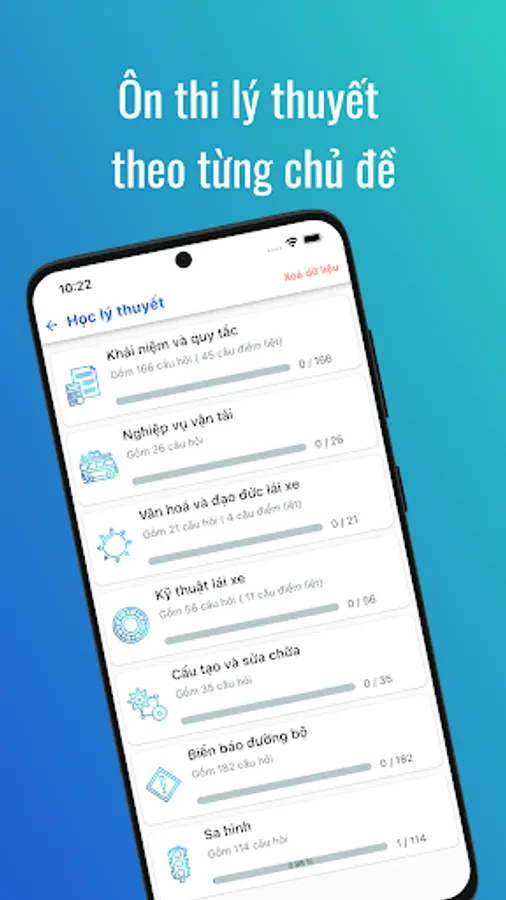 The application includes a full set of 600 driving theory questions issued by the Directorate for Roads of Vietnam.