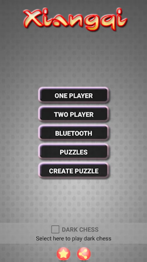 - Play Mode: Bluetooth, Darkchess (Co Up), One Player, Two Player, Puzzle, How to solve Puzzle, Create chess position Mode