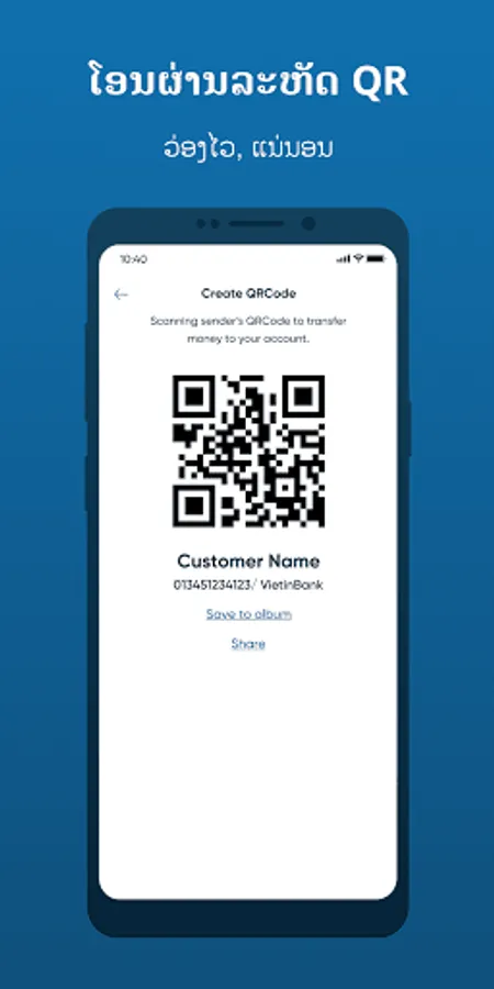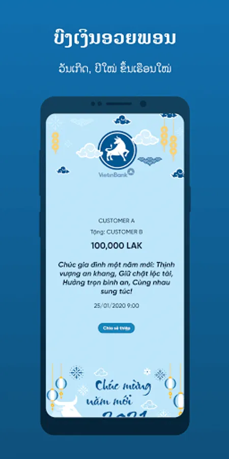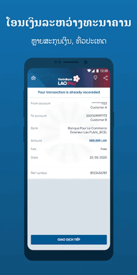 Welcome to VietinBank LAO! Thank you for your trust and use of LAOiPay Mobile application. VietinBank LAOiPay is the official Mobile Banking application for Individual Customers in Laos. The application is compatible with iOS/Android operating systems and can run on smartphones, tablets with Internet connection. Let’s discover and enjoy amazing features of the app: - Stylish, modern, youthful interface and extreme ease of use. - Utility Bill Payment: Telecommunications, Electricity, Water,... - Internal Fund transfer 24/7. - Domestic Fund transfer. - Online Saving, Loan Repayment. - Sell foreign currency online. - Send greeting money on special occasions to relatives, friends and partners. - OTT Message service on the application helps customers easily register and manage account information. - Support set schedule for recurring and future fund transfers. - Using Soft OTP authentication in addition to the traditional SMS OTP method to improve security and safety for your accounts. And many other useful features! To register to use LAOiPay, please go to the nearest branch or transaction office of VietinBank Lao.