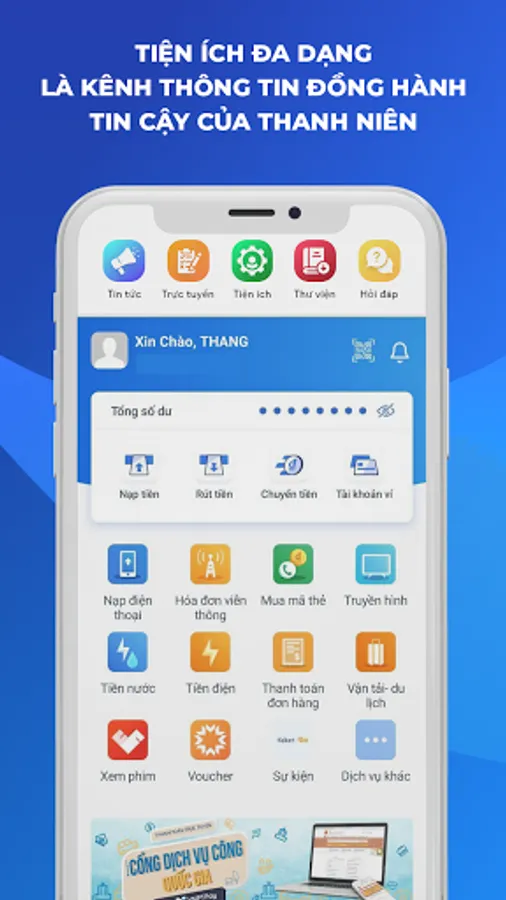 The Vietnam Youth Application is a channel for union members to participate in activities organized by the Central Youth Union of Ho Chi Minh City, such as updating news information, taking online exams, studying online, being consulted and answered. use benefits of job placement, technology, library ... to help union members, members, young people grasp basic information about the activities of the Union, Union, thereby attracting young people to participate. participating in the organization and activities of the Union and Association, expanding the united front for youth gathering.