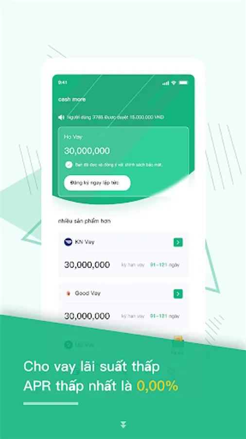 Cash More is an online lending platform specially designed for Vietnamese people, providing users with stable, convenient financial loan services, easy filing, transparent interest rates. According to the loan amount, loan term, loan interest rate, you can choose the most suitable loan product for yourself.