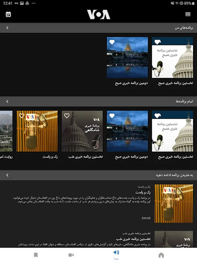 توسط اپلکیشن رایگان *رسمی* صدای امریکا شما خبرها را در موبایل/تبلیت تان دنبال کرده میتوانید. صدای امریکا یکی از بزرگترین شبکههای بینالمللی رسانهای را با نشرات تلویزیونی، رادیویی و دیجیتل گردانندگی کرده و هر هفته به بیش از ۲۰۰ میلیون نفر در سرتاسر جهان به شمول افریقا، شرق میانه، آسیا و فراتر از آن نشرات دارد. برای انجام این کار، صدای امریکا بیش از ۳۵۰۰ خبرنگار را استخدام کرده است که تمرکز کار آنان بر کشورهایی است که در آن رسانههای آزاد یا دسترسی آزادانه و باز به انترنت وجود ندارد.