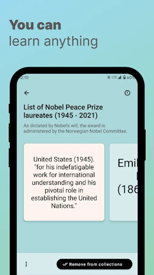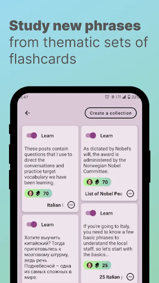 The app provides an easy way to memorize the learning material you need. Create your own collections of flashcards or choose from those already created by other students. We are trying to make a simple and convenient app for learning foreign languages, vocabulary, history, and science in a simple and effective way.
