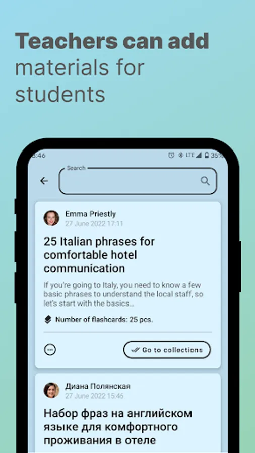 - If you are a teacher. Create a public list of words and expressions in the app, then share the link or name of your collection with your students. Your students will be able to learn the material more effectively.
