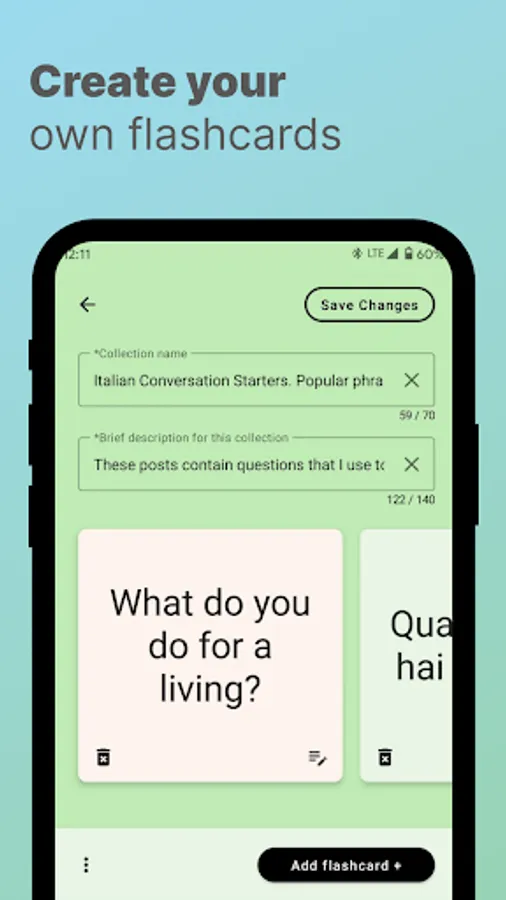 You can learn foreign languages with flashcards: create word cards, improve your vocabulary, memorize words with our efficient algorithm. The app can work without Internet.