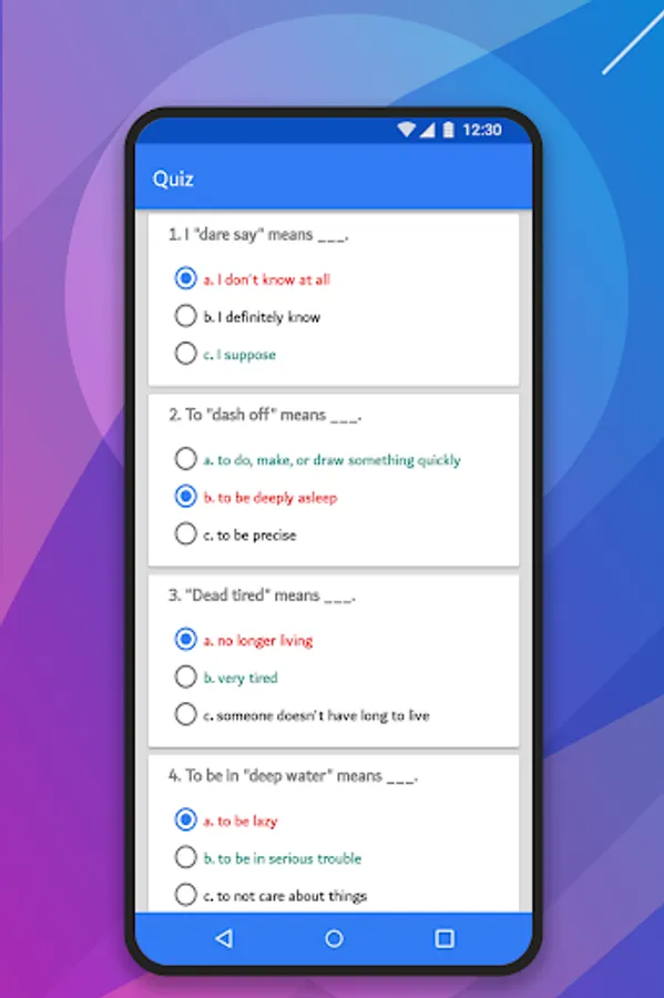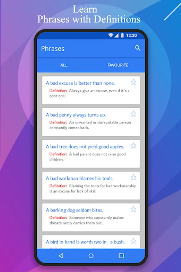 Daily Notifications – The app daily sends you Idiom, Phrase, or Proverb of the Day to automatically teach you these English provers, idioms, and phrases on daily basis.