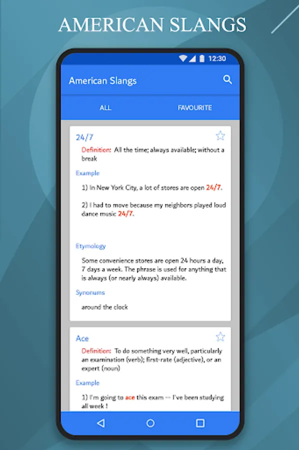 Definition, Meaning & Examples – The application gives definition, meaning, and example of each phrase, idioms, slang, and proverbs. This helps the user to understand the use of idioms, phrases, slangs, and proverbs.