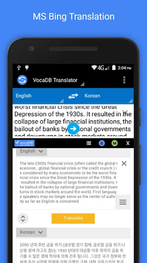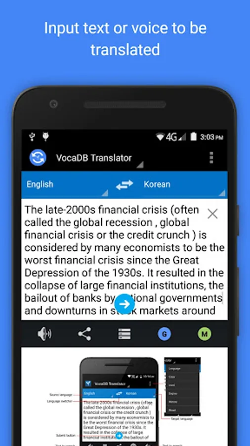 The app supports 38 languages. It is powered by VocaDB's Translation with Word Extraction API and the APIs of Google Translate and MS Bing. Text from other apps can also be shared to vocaDB Translator.