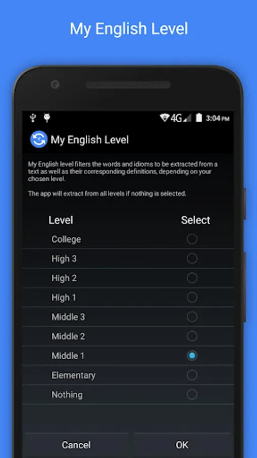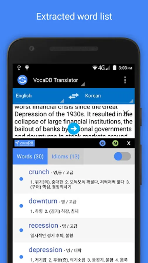 Aside from basic translation function, this Translation app is capable of generating a list of words and idioms extracted from an input text. It also provides vocabulary information relevant to language learners.